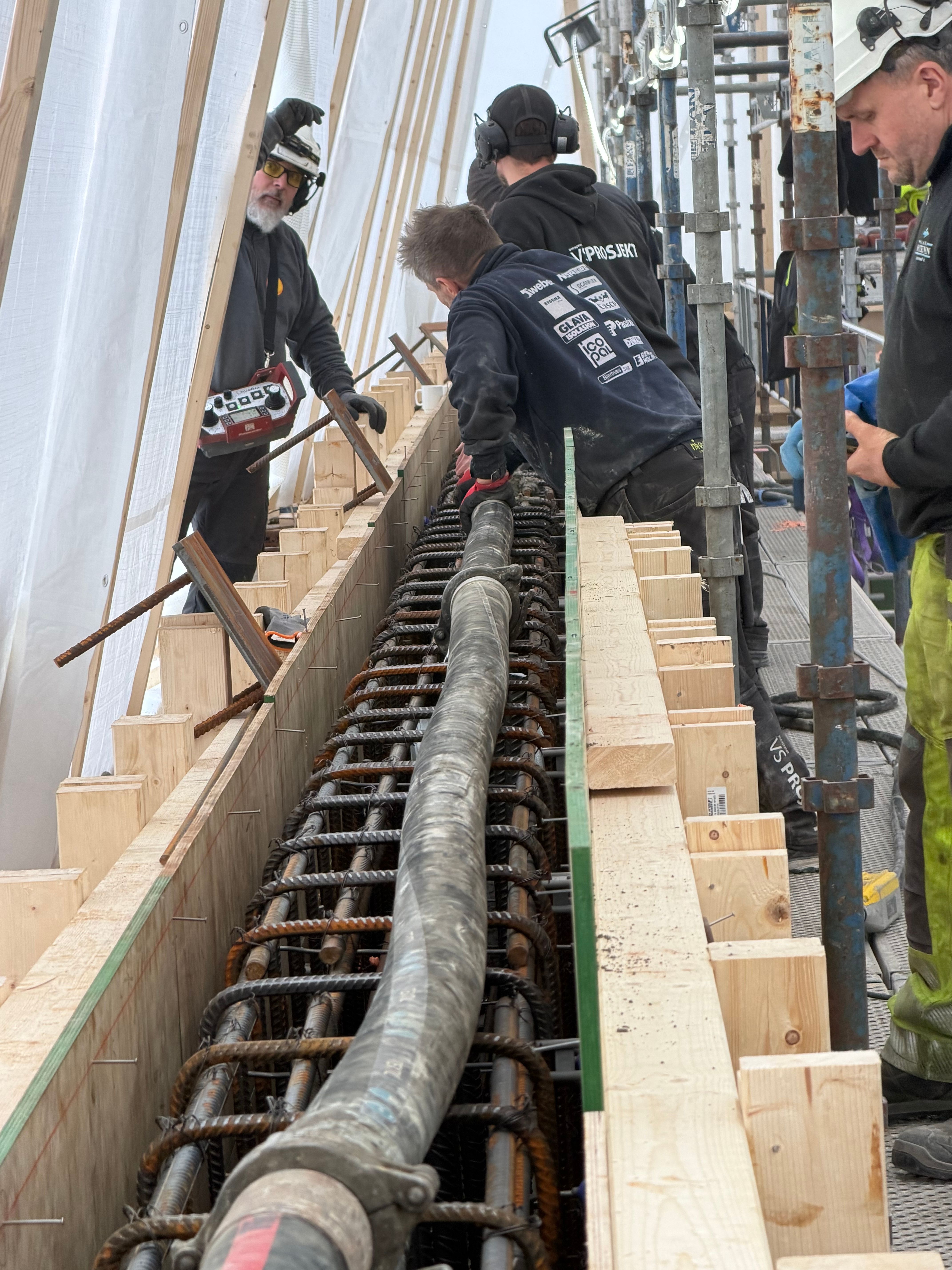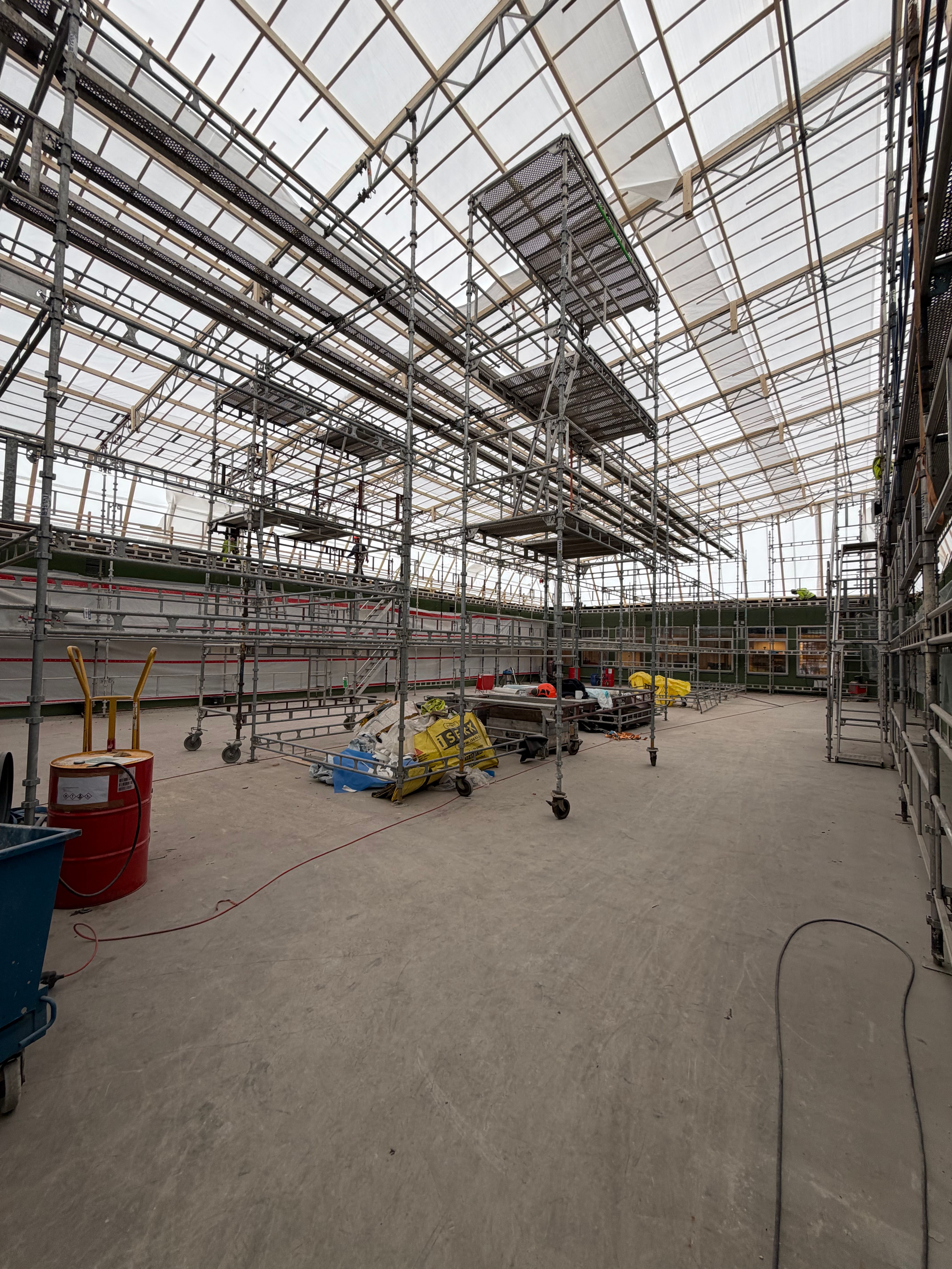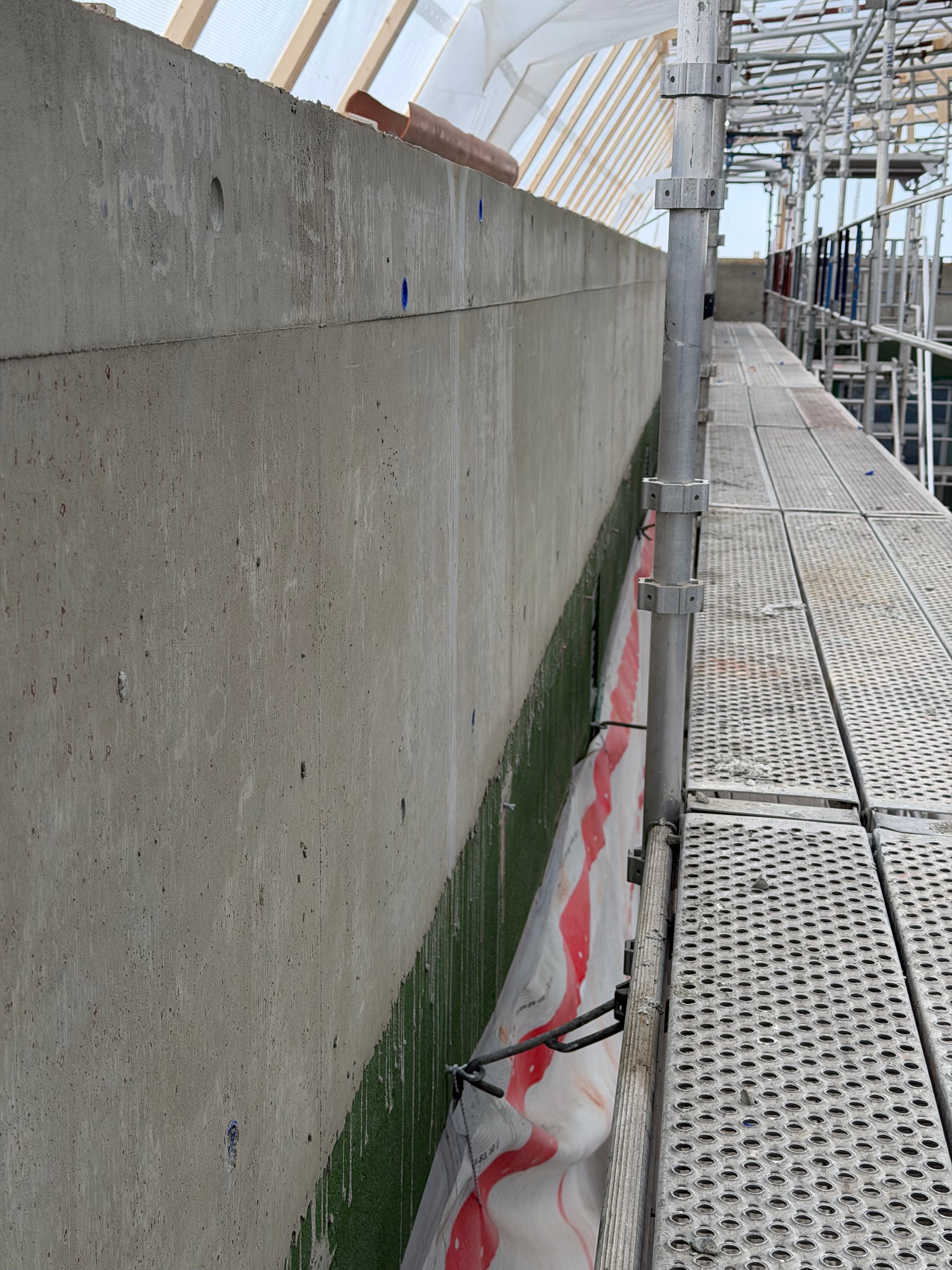 Det er utført ny ringmur i 3. etasje som fundament for stålkonstruksjon og glasstak. Arbeidet omfattet levering og støp av ca. 40 m³ betong, samt boring av 350 hull (Ø35 mm, dybde 600 mm) for gysing og forankring mot eksisterende vegger.